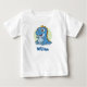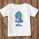 Esta camiseta infantil personalizada e encantadora apresenta um dinossauro azul bebê de desenho animado com olhos grandes e expressivos e um sorriso alegre.