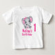 Uma t-shirt personalizada para o primeiro aniversário (ou qualquer idade!) de uma criança. Projetado com uma ilustração de aquarela elefante rosa e fofinha. Ela tem orelhas bonitinhas, cor-de-rosa e bolinhas branca e arco bonito de fita rosa sobre a cabeça.