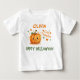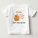 Esta camiseta de bebê adorável é perfeita para a festa de Halloween do seu pequeno(a) 😊! Ela apresenta uma abóbora feliz, o texto "Feliz Halloween", "Abóbora Fofa", e corações e estrelas. O body pode ser personalizado com o nome da criança.