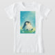 Um pintinho de pinguim giro e liso, com olhos fechados, está sentada contente em meio a um verde sob um céu azul brilhante com speck brancos flutuantes. A cena evoca uma atmosfera tranquila e alegre.