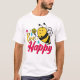 Esta camiseta branca apresenta uma belíssima abelha cartoon com um rosto sorridente, segurando uma flor amarela. As palavras "Bee Happy" são escritas numa mistura lúdica de escrita amarela e cor-de-rosa, rodeada por pequenos gráficos florais e estelares coloridos. É um design brilhante e elevador.