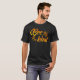 Esta camiseta preta apresenta as palavras "Abelhas" em uma escrita fluente, em tons quentes, acompanhada de uma ilustração detalhada de uma abelha e de um aglomerado de favos de mel. A design promove uma mensagem de gentileza e apreço pelas abelhas e pela natureza.