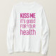 Declare as suas necessidades com uma dose de charme na nossa "Beije-me que é bom para a sua saúde". A mensagem ousada, mas simples, é reproduzida em uma fonte rosa, limpa e atraente que adiciona um toque de doçura e confiança ao seu estilo. É a camisa perfeita para aqueles que acreditam que um beijo é o remédio mais doce e uma maneira simples e na moda de mostrar uma personalidade divertida.