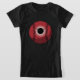 Descrição: Imagem de uma bola vermelha de basebol com costura preta, com um círculo preto central rodeado por um efeito de gradação brilhante. Duas formas de crescente flanqueam o círculo central, criando um design misterioso ou lunar. O fundo escuro melhora a inquietação e a sensação atmosférica.