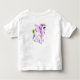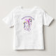 Uma t-shirt personalizada para o aniversário de uma criança. Projetado com uma imagem de um unicórnio com grandes olhos azuis, asas cor-de-rosa e um arco-íris e cauda. Kawaii fofo.