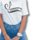 Uma mulher abençoada veste seu coração na manga: a tipografia negra em baixo-relevo e um coração com uma imagem cruzada.