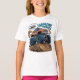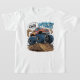 Uma ilustração vibrante e lúdica para uma camiseta monstruosa para crianças, com um grande e colorido caminhão monstro com rodas sobredimensionadas, dominando rampas e montanhas de terra. O caminhão é adornado com números de corridas e adesivos, e ele cria uma trilha de enfumaçado do seu escape. A energia infantil é evidente na design, com uma bolha de fala a ler "ESSAS CRIANÇAS ADORAM MONSTER TRUCKS". A estética geral é perfeita para inspirar a imaginação jovem e para paixão por caminhões monstros.