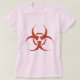 O símbolo do biohazard em vermelho, afligido levemente, em t-shirt, em camisolas, em etiquetas, em cartões & em artigos do presente.