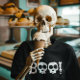 O plano de fundo apresenta uma cor sólida preta personalizável... você pode mudar isso. O tema do Dia das Bruxas é o Tempos Negros para outubro. Estilo Grunge boney B e crânios "BOO!" tipografia.