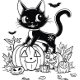 A black and white cartoon illustration features a black cat standing atop a collection of Halloween pumpkins. The cat has large, expressive eyes and a small white asterisk on its side. It is positioned above several pumpkins with carved faces, each displaying a different expression. Above the cat, two bats are flying. The pumpkins are surrounded by leaves, adding to the Halloween theme. The style is simple and graphic, reminiscent of a coloring book page.