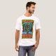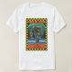 Esta arte de ficção científica foi criada usando a arte AI para se parecer com a arte antiga de ficção científica. Ela tem uma colagem de um homem espacial com um visor vermelho solteiro em seu capacete, descansando sobre os ombros de uma forma esquelética que está caminhando na superfície de outro planeta. As cores brilhantes e a aparência de perigo dos cheques preto e amarelo fazem com que esta camisa seja pop.