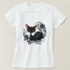 Filigree Black Cat with large green eyes sitting in a cradle of flourishes and black flowers on a bold red background women's t-shirt.