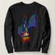 Um pequeno dragão azul com asas roxas, verdes e azuis se curva ao redor de uma guitarra de sol vermelha, laranja e amarela, sua cauda e pescoço envolto gentilmente na base e no pescoço do violão. Uma mistura mágica de música e fantasia perfeita para amantes de música e fãs de fantasia.
