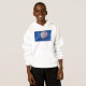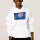 A colorful aerostatic hot air balloon seen from below sits against a deep blue, starry background. The design is vibrant with red, white, and blue segments, surrounded by scattered small yellow and white accents.