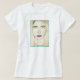 Uma blusa esbranquiçada com um retrato melancólico de uma mulher,