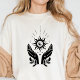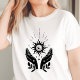 Abraçar a energia celestial com esta camisa inspirada no véu, com as mãos a chegar a um sol radiante e à lua crescente. O design minimalista é enfeitado com sotaques folhosos e detalhes cósmicos, criando uma poderosa declaração visual. Perfeito para aqueles que amam estética boho e simbolismo espiritual, esta camisa combina a natureza, o cosmos, e um sentido de empoderamento. O esquema de cores preto e branco o torna versátil para qualquer guarda-roupa, enquanto o design impressionante acrescenta um elemento de mistério e profundidade. Vista esta camisa para canalizar vibrações positivas e energia celestial onde quer que você vá.