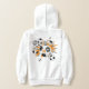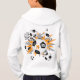 O capuz de futebol desta desportista apresenta uma "explosão" de esferas de futebol de dimensão variada e formas laranja, cinza e estrela branca - um pequeno padrão de bolinhas brancas sobrepõe a estrela da cinza - personalizado com o nome do atleta, monograma e número de camisola - o design está na frente do capuz mas pode ser movido ou duplicado no verso - por katz_d_zynes