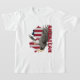 Esta camiseta para crianças apresenta um design gráfico dinâmico de uma águia em voo de médio com suas asas espalhadas, sobreposta à silhueta de um contorno de mapa dos Estados Unidos. O fundo inclui um padrão de bandeira americana com listras vermelhas e brancas e um campo azul com estrelas. A palavra "AMERICAN" aparece em letras maiúsculas e design. Esta design simboliza o orgulho e a identidade americanos, fazer-a uma escolha perfeita para jovens patriotas.