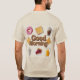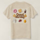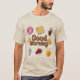 Essa camiseta apresenta uma rosquinha rosa-fosco, torrada, chocolate quente com chantilly, mais torrada, uma xícara de chocolate quente com chantilly, uma fatia de torta de cereja e um lançador de suco de laranja com as palavras Boa Manhã no centro. O estilo de arte da imagem de t-shirt é fotografia digital. A imagem está na frente e atrás da camiseta. A camiseta é uma camiseta masculina de areia.