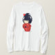Boneca oriental de kokeshi em um vestido de quimono de cereja escura com uma grande cintura obi segurando uma lanterna de papel de festival amarela. O cabelo preto da menina é decorado com flores e pinos do estilo geisha.