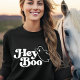 Uma bela e longa escolha de camisa de manga para o Dia das Bruxas, esta design apresenta um gráfico fantasma com tipografia branca Hey Boo em letra de na moda em uma camisa preta. Outras cores e estilos de camisa também estão disponíveis.