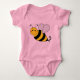 Um amarelo grande e um preto bumble a abelha com um sorriso e corações pequenos nos mordentes.