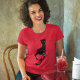 Uma camiseta vermelha elegante e personalizável, com uma bela ilustração de um mau preto gracioso com olhos brilhantes num relógio noturno.