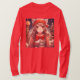 Menina de anime bonita com gatinho laranja com luzes de Natal nos fundos da camisa de inverno.