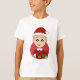 Camiseta infantil com ilustração de um menino caucasiano sorridente e bonito com cabelo loiro curto, o menino está vestindo uma fantasia de Papai Noel com um chapéu vermelho e segurando um presente; em um círculo vermelho sobre fundo vermelho, um design de cartoon de Natal