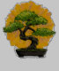 Uma bela ilustração de uma árvore bonsai que se senta num pote preto contra um fundo circular amarelo brilhante.