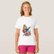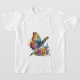 Um design de camiseta brilhante e alegre da borboleta. O centro apresenta uma borboleta grande e colorida, com asas espalhadas ao largo, decorada com cores vibrantes em tons de rosa, roxo, azul e amarelo. Ao redor da borboleta, você pode encontrar pequenas flores.