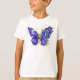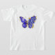 Borboleta de flores cinza, azul, safira, espumante com asa decorada com flores preciosos azuis com folhas de ouro sobre fundo branco.