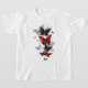 Bando de borboletas voadoras, realistas, vermelhas e pretas em fundo branco com gotas de tinta.