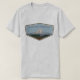Esta camiseta Boring, Oregon, apresenta um design de patch ao ar livre com uma imagem aproximada do estilo tinta por número do Monte Hood. O texto está em cartaz angustiado e diz "Boring Oregon" com "Estabelecido em 1903", logo abaixo. As cores incluem vários tons de azul, verde, marrom e creme.