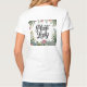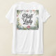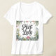 Esta t-shirt de senhora das plantas apresenta uma ilustração ao estilo aquarela de um design de quadro botânico com as palavras Planta Lady em letras pretas centradas no meio. O texto é reproduzido por elementos florais decorativos, incluindo rosas cor-de-rosa, flores roxas e várias folhas verdes e samambaias dispostas em comum. Na imagem mais baixa você vê plantas com vasos, incluindo uma grande suculenta de cinzas azuis, uma rosa-rosa em um pote listrado, uma pequena suculência verde, uma planta alta e pontiaguda e uma rodada suculenta em potes da terra. A ilustração tem um fundo branco e está em um estilo de arte suave e botânica com pinceladas e texturas de aquarela. A camiseta é uma camiseta branca de pescoço-V. A t-shirt é feita de uma camisa de algodão com 100% de anel.