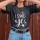 Eu disse que sim para a futura senhora com uma charmosa design de tipografia branca com um diamante a apontar o i e um pequeno coração abaixo do sim. t-shirt de tipografia festa de solteira para a noiva ser. Noiva de ser t-shirt com eu disse sim num design de tipografia branca.