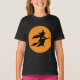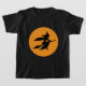Um vôo da bruxa na frente de uma Lua cheia em sua vassoura.