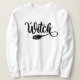 Este design preto-e-branco apresenta a palavra "Bruxa" em uma letra de script audível e em negrito, com a extremidade posterior da letra "h" transformando-se na alça de uma vassoura. O texto está estilizado com um olhar lúdico e escrito à mão, acrescentando um toque caprichoso ao tema geral. Ao redor da palavra estão estrelas dispersas, criando um efeito mágico, noturno estrelado que melhora o tema brutal. A vassoura, posicionada diagonalmente sob o texto, acrescenta um elemento dinâmico à design, sugerindo movimento e profundidade.