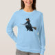 Uma bruxa com uma cabeça de macaco está voando numa vassoura.