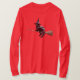 Um gato preto está vestido como uma bruxa e está voando numa vassoura.