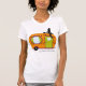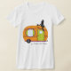 Bruxas com texto de caligrafia e trailer vermelho-laranja e verde com bunting e estrelas e bruxa negra com vassoura, chapéu pontiagudo e botas cortantes de dedos tocados no topo do trailer.