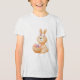 This sweet bunny illustration features a gentle rabbit holding a basket filled with pastel Easter eggs, decorated with soft patterns and watercolor textures. The floral crown and warm color palette add a joyful springtime feel while keeping the overall mood calm and nursery-friendly.