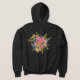 Uma rosa-rosa-esbranquiçada é o ponto focal deste spray floral colorido. O fundo preto da camisola realmente deixa o buquê "pop". Outras cores incluem amarelo, pêssego, lacre, roxo, azul e laranja.