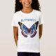 A high-contrast, symmetrical, stylized artistic illustration of a colorful butterfly with BUTTERFLY text spelled above the design. A perfect T-shirt for any occasion.
