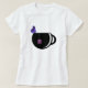 Uma ilustração dramática com uma xícara de chá preta, etiqueta de teabag roxa e uma borboleta roxa e azul na borda da xícara.
