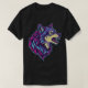 uma ilustração psicodélica vibrante de uma cabeça de lobo com cores neonatais e expressão feroz que mostra o uso artístico de matizes roxas, azuis e rosa