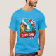 Um tubarão-desenho vestindo uma boia salva-vidas saboreia um cachorro-quente com tranças vibrantes, cercado por ondas salgadeiras e elementos coloridos de design. O texto "Cape Cod" é exibido com destaque numa fita vermelha por baixo do tubarão.