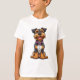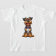 Cachorro alegre sentado com um grande sorriso. Tem um casaco preto e marrom com uma mistura de pelo fofinho e um corpo elegante. O cão tem olhos brilhantes e expressivos e um comportamento brincalhão. Ele usa uma coleira colorida adornada com amuletos e padrões. O fundo é branco simples, o que enfatiza a aparência vibrante e a personalidade do cão. No geral, o cão parece amigável e cheio de energia.
