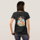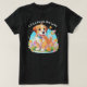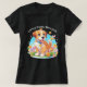 Uma t-shirt feminina com uma fotografia de um filhote fofo sentado entre as flores. Ele parece muito feliz por estar cercado por flores e borboletas. O presente perfeito para dar àqueles que amam cachorros. O slogan é "Pequenas patas, Grande Amor". Contém conteúdo generativo.