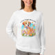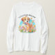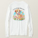 Uma camiseta de manga longa com uma foto de um filhote fofo sentado entre as flores. Ele parece muito feliz por estar cercado por flores e borboletas. O presente perfeito para dar àqueles que amam cachorros. O slogan é "Pequenas patas, Grande Amor". Contém conteúdo generativo.